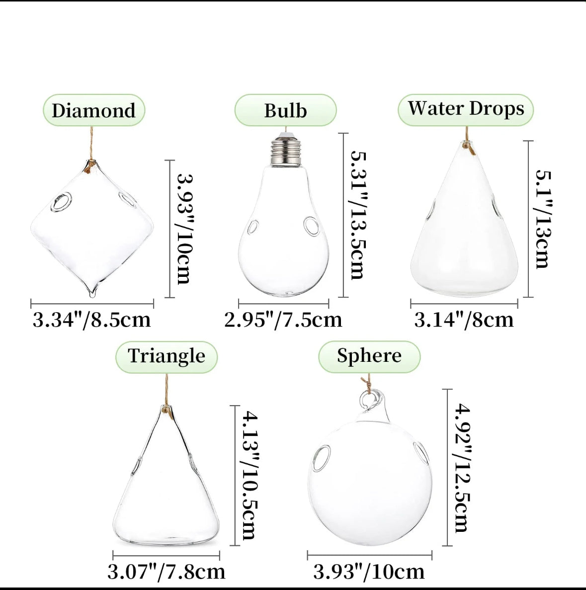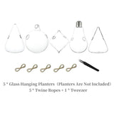 Add elegance and natural charm to your home with this set of five hanging glass planters in unique shapes including bulb, sphere, diamond, water drop, and triangle. Perfect for air plants, small floral arrangements, or water based propagation, they create a stunning floating garden effect when hung by windows or used as decorative accents in living rooms, bedrooms, or offices. The clear glass allows light to highlight your plants while brightening your space. Each set includes natural twine ropes and a precision tweezer for easy setup and plant placement, making it both stylish and practical. Ideal for your own décor or as a thoughtful gift, these planters bring a vibrant and modern touch to any setting.