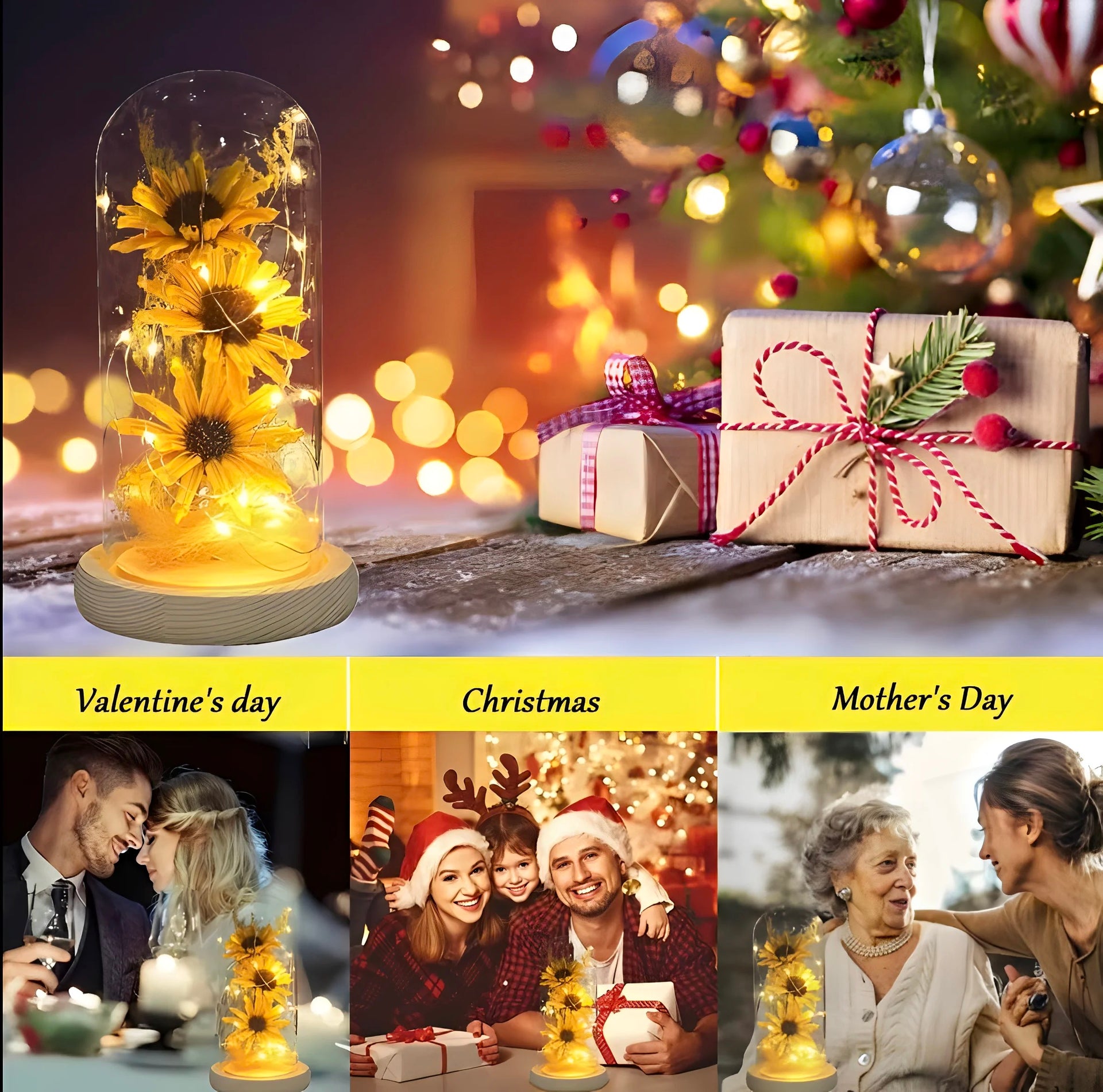 This enchanted sunflower lamp combines beauty and warmth in a stunning glass dome design. Featuring lifelike artificial sunflowers illuminated by a soft LED strip, it creates a cozy and uplifting glow that brightens any room. Perfect for home dΓ©cor or as a heartfelt gift, it is ideal for occasions like Motherβs Day, Valentineβs Day, birthdays, weddings, and more. With its eco-friendly lighting and artistic design, this sunflower lamp is a lasting symbol of love, happiness, and positivity.
