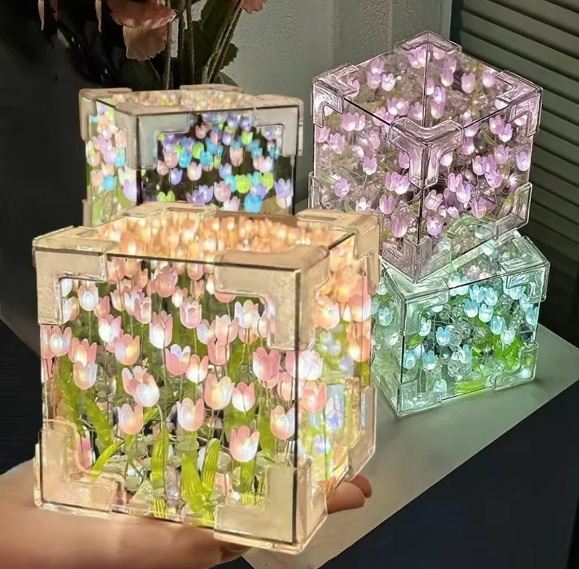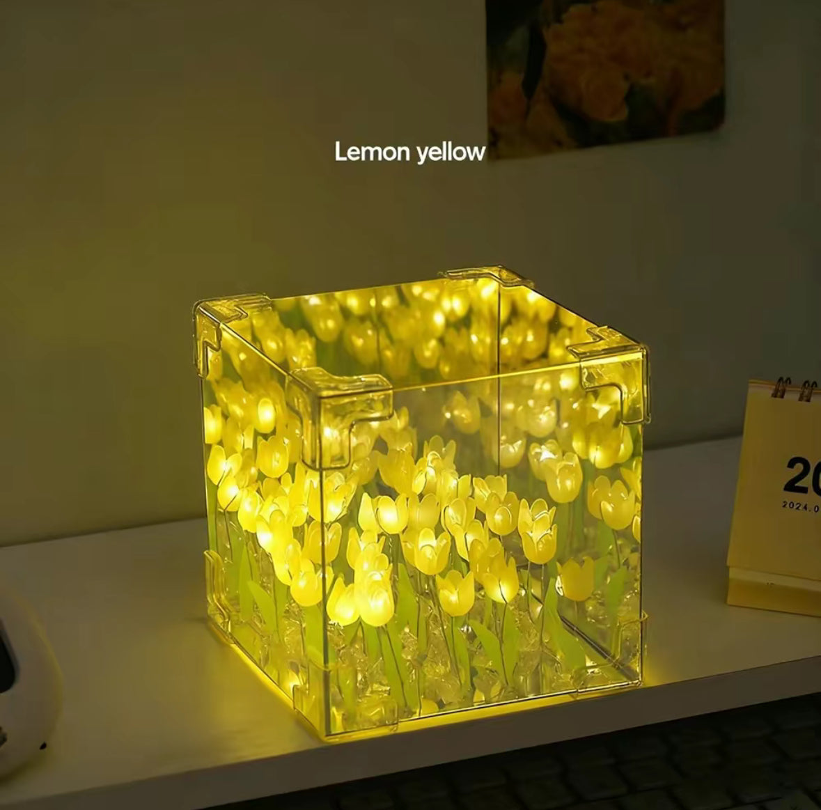 Create a magical atmosphere with this tulip night light LED mirror lamp, designed to reflect the beauty of an endless tulip garden. Its soft LED glow and mirrored infinity effect bring warmth and calm to any room, while the modern cube design adds style even when turned off. Packaged with a gift bag, it makes a thoughtful present for mothers, friends, couples, or teens, offering both elegance and charm in one unique piece.