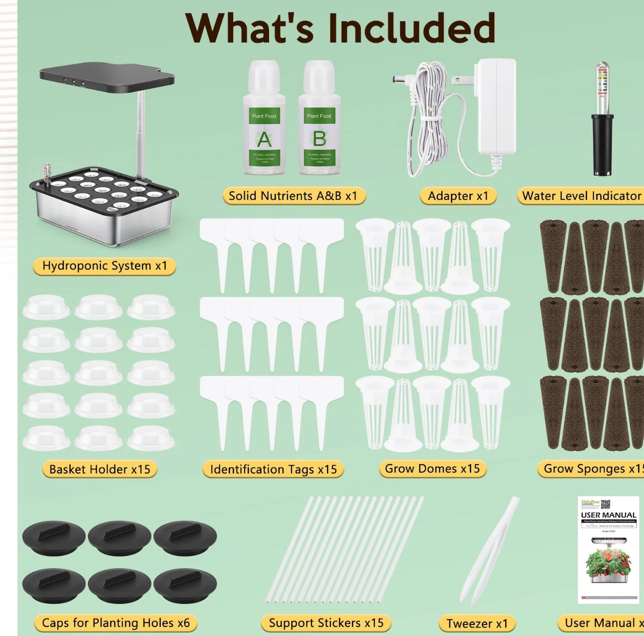 Enjoy fresh herbs and vegetables year-round with this 15-pod hydroponic growing system. A 24W LED grow light simulates natural sunlight to help plants grow faster and healthier, while the 6L water tank and built-in pump ensure roots stay oxygenated and nourished. The automatic timer makes plant care simple, giving you effortless growth of herbs, vegetables, or flowers indoors. Sleek and practical, it’s a convenient way to add greenery to any space.