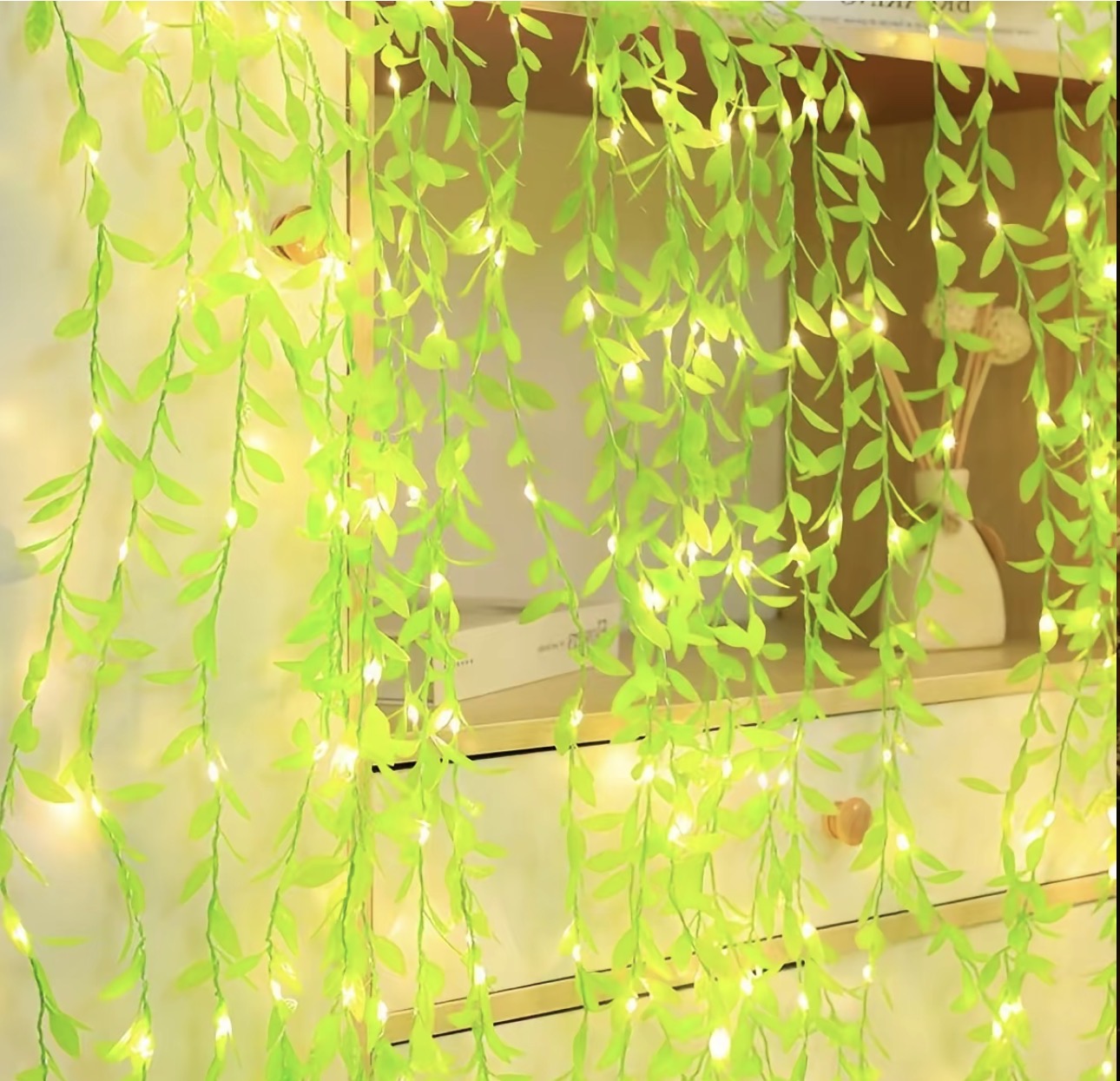 Bring warmth and elegance to any space with this USB powered willow leaf string light, featuring 100 energy efficient LEDs woven among lifelike leaves. Perfect for creating a magical atmosphere, it adds a soft glow to Christmas trees, bedrooms, terraces, weddings, parties, and holiday celebrations. The lightweight, flexible design makes it easy to drape, hang, or wrap around furniture, walls, or plants, instantly transforming your space into a cozy and festive retreat.